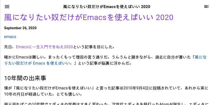 風になりたい奴だけがEmacsを使えばいい 2020 - https://blog.tomoya.dev/posts/only-those-who-want-to-be-the-wind-should-use-emacs-2020/ ↩︎